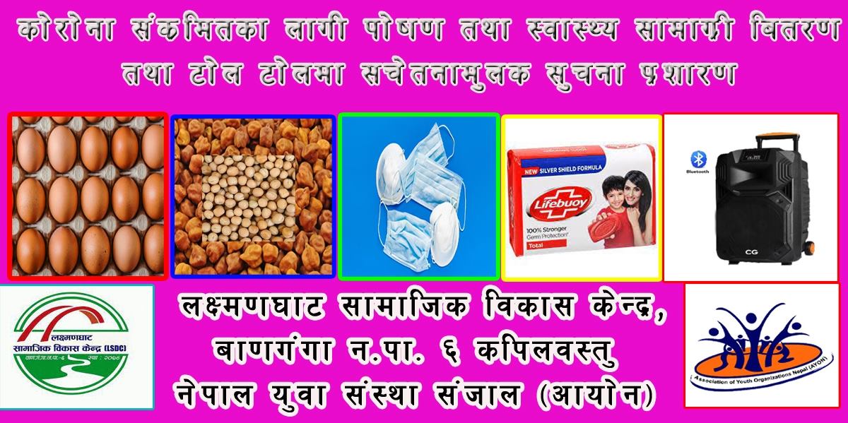 कोरोना संक्रमितहरुका लागी पोषण सामाग्री अण्डा,चना, माक्स,साबुन लगायतका सामाग्री बितरण गरिएको छ । सो को लागी लक्ष्मणघाट सामाजिक विकास केन्द्रका संस्थापक सदस्य शालिकराम पन्थीले सहयोग गरका थिए । कार्यक्रमको समन्वय बाणगंगा नगरपालिका वडा नं ६ का वडाध्यक्ष सुकदेव थारुले गरेको लक्ष्मणघाट सामाजिक विकास केन्द्रका कोषाध्यक्ष सन्दिप न्यौपाने बताए ।
