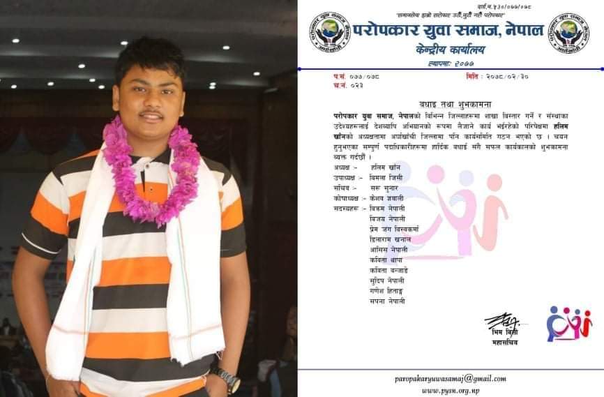 अर्घाखाँची । परोपकार युवा समाज नेपाल अर्घाखाँचीबाट अध्यक्ष पदमा हलिम खाँन मनोनित भएका छन् ।उनी अध्यक्षमा मनोनित भएपछी खाँनले आफुले पाएको जिम्मेवारी पुर्ण रुपमा कटिबद्ध भएर निभाउने बताएका छन ।