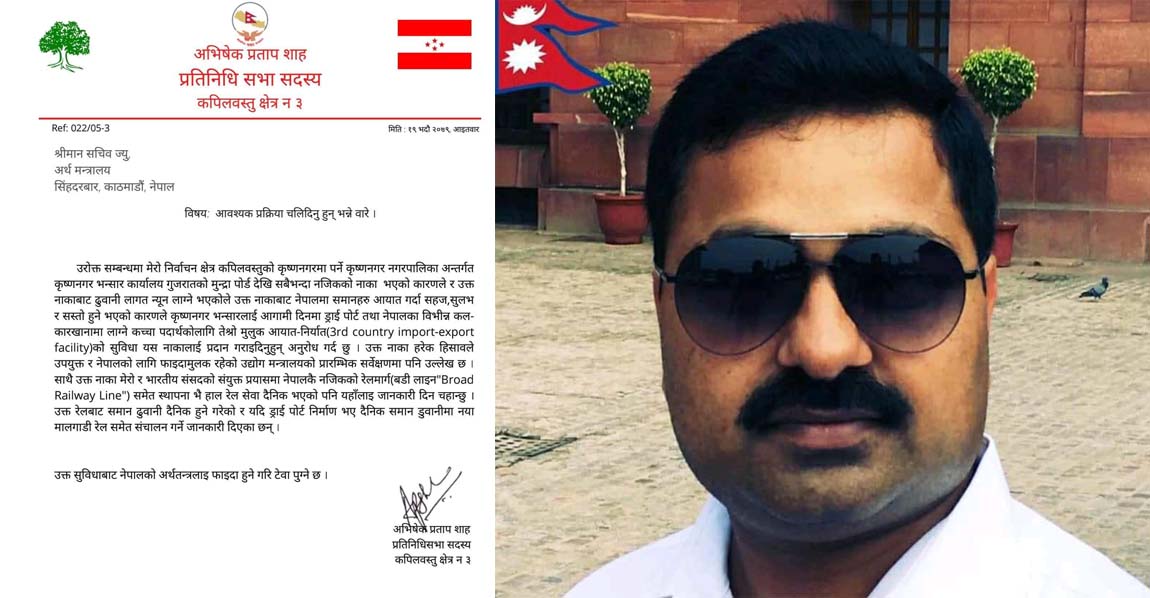 काठमाण्डौं । प्रतिनिधि सभा सदस्य अभिषेक प्रताप शाहले कृष्णनगर भन्सारबाट आयात निर्यात सुविधा मिलाउन अर्थ मन्त्रालय संग माग गरेका छन् । प्रतिनिधि सभा सदस्य शाहले कपिलबस्तु जिल्लाको कृष्णनगर नगरपालिका अन्तर्गत कृष्णनगर भन्सार कार्यालय भारतको गुजरात मुन्द्रा पोर्ड देखी सबै भन्दा नजिकको नाका भएको भन्दै सो नाकामा उक्त सुबिधा मिलाउन माग गरेका हुन् ।