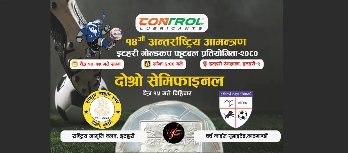 काठमाडौँ– इटहरी गोल्डकपको अन्तिम सेमिफाइनलमा आज चर्च ब्वाइज युनाइटेड काठमाडौँ र आयोजक राष्ट्रिय...